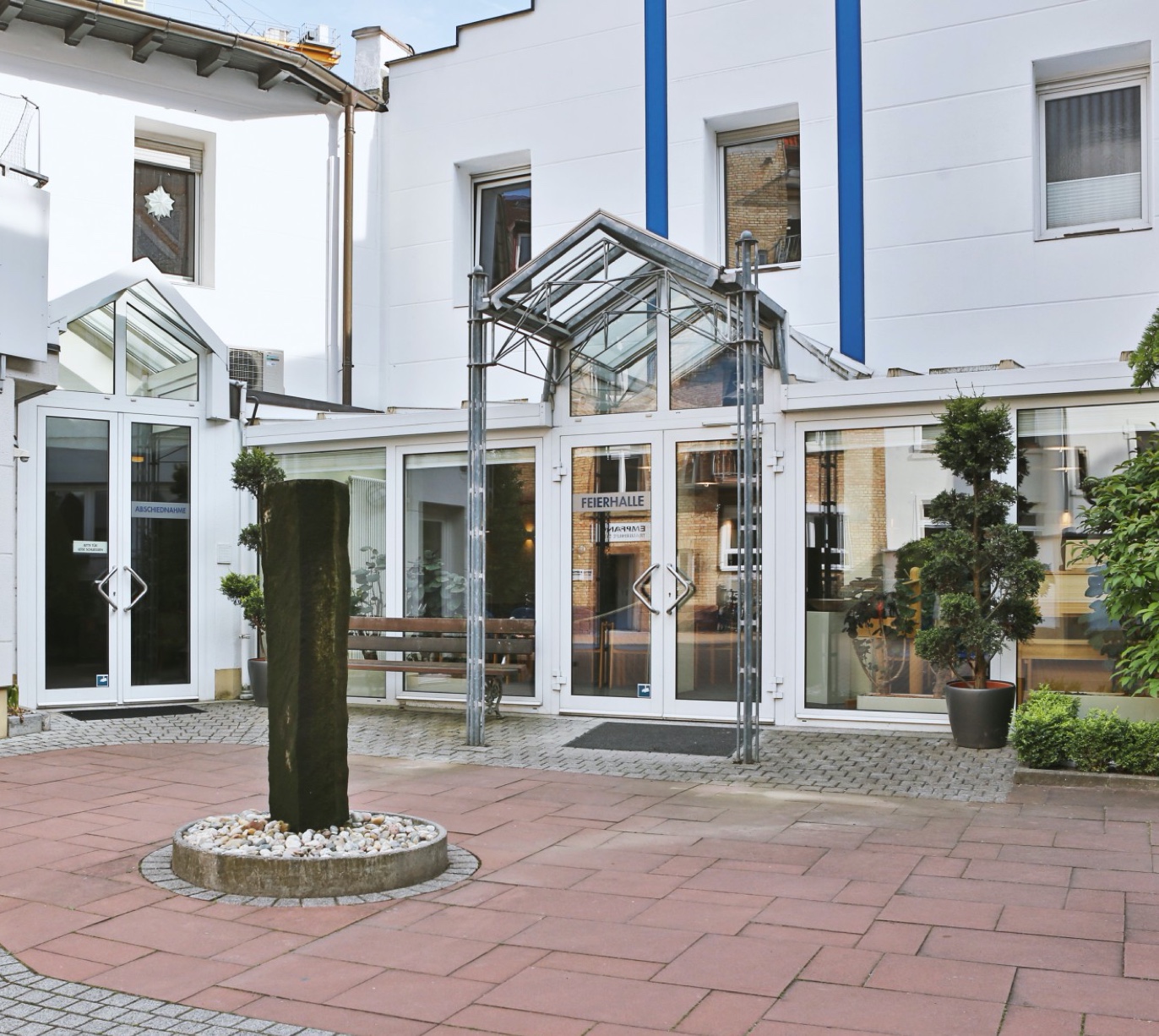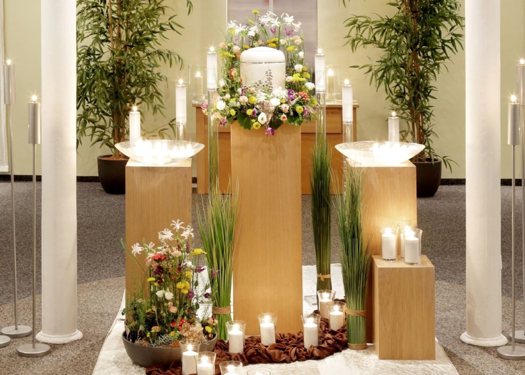 Mit unserer hauseigenen Trauerhalle bieten wir Ihnen einen neutral gestalteten Rahmen für klassische Trauerfeiern oder einfache, selbst gewählte Andachten. Da wir eine aktive Auseinandersetzung mit dem Abschied für richtig und wichtig halten, unterstützen wir Sie bei der Umsetzung Ihrer Ideen unabhängig von Religion, Kultur oder anderen gesellschaftlichen Vorgaben. Musik, Texte, Dekoration sowie der Ablauf der Trauerfeier – alles können Sie frei wählen. Für die musikalische Begleitung der Trauerfeier stehen eine Orgel und ein Klavier bereit – spielen Sie gerne selbst darauf oder wir bestellen Ihnen einen professionellen Organisten bzw. Pianisten.