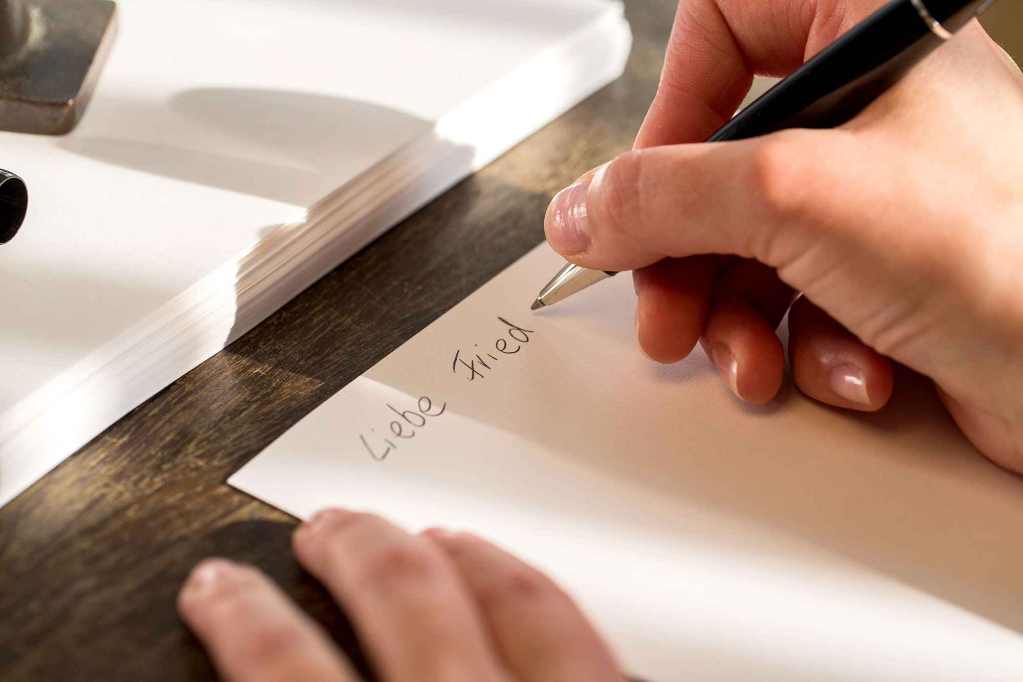 - Wenn Sie in Schriftform kondolieren, schreiben Sie am besten von Hand mit Tinte auf schlichtem weißen Papier oder einer selbstgestalteten Trauerkarte. Ein Brief bietet aber mehr Platz und wird eher aufbewahrt als eine Karte. Natürlich gibt es auch vorgefertigte Trauerkarten aus dem Handel, die allerdings etwas unpersönlich wirken können, wenn Sie den Angehörigen nahestehen.